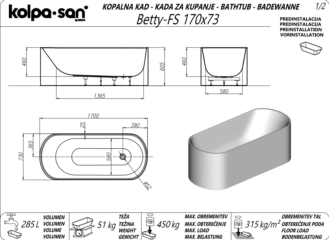 Отдельностоящая акриловая ванна Kolpa-san Betty FS 170х73 см