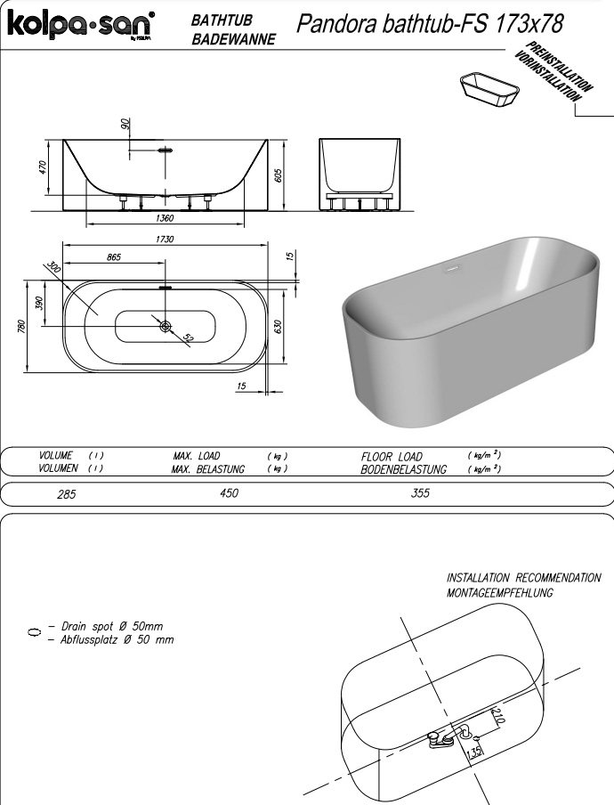 Отдельностоящая акриловая ванна Kolpa-san Pandora FS 173х78 см