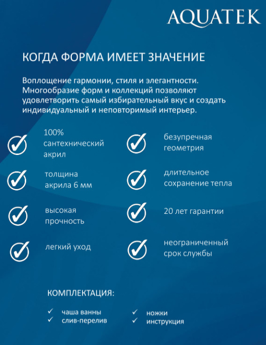 • Длительный срок службы. На все акриловые ванны Aquatek предоставляется гарантийный срок 20 лет