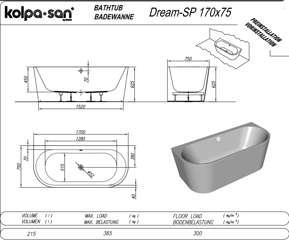 Пристенная акриловая ванна Kolpa-san Dream SP 170х75 см
