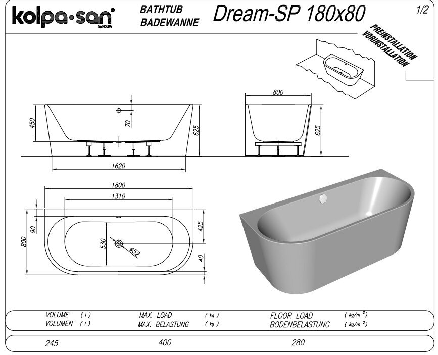 Пристенная акриловая ванна Kolpa-san Dream SP 180х80 см