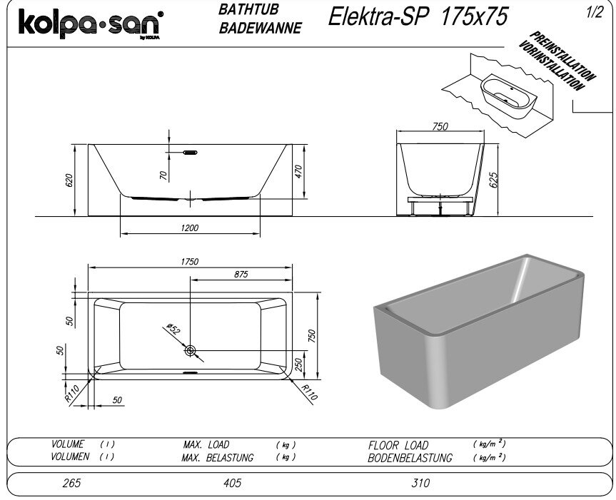 Пристенная акриловая ванна Kolpa-san Elektra SP 175х75 см