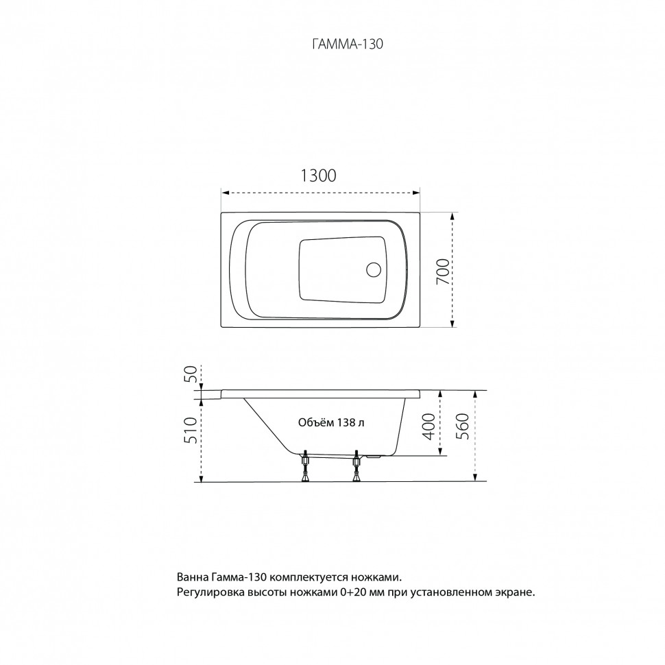 Прямоугольная акриловая ванна 1ACReal Gamma 130х70 см Щ0000028715