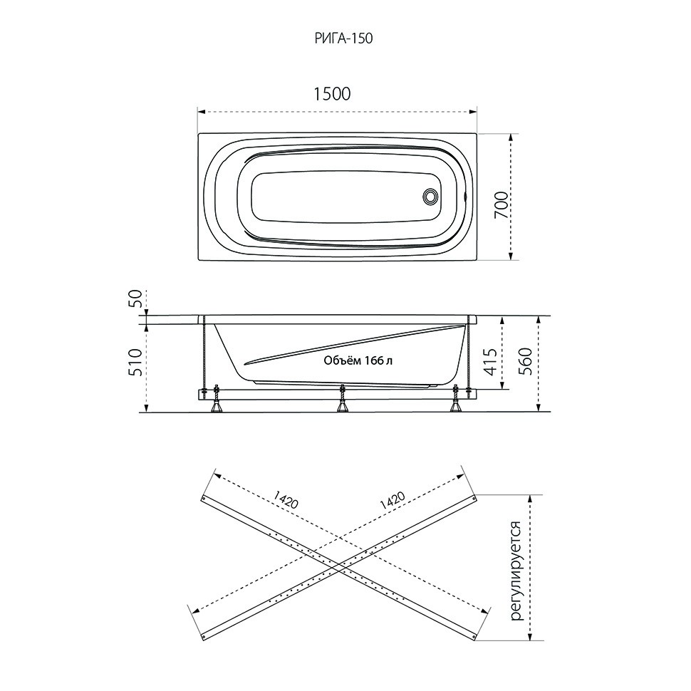 Прямоугольная акриловая ванна 1ACReal Riga 150х70 см рифл дно Щ0000040945