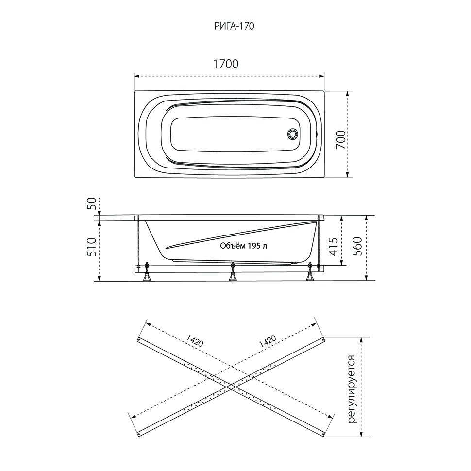 Прямоугольная акриловая ванна 1ACReal Riga 170х70 см рифл дно Щ0000040946