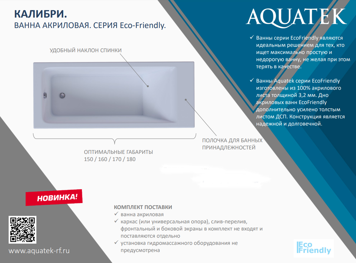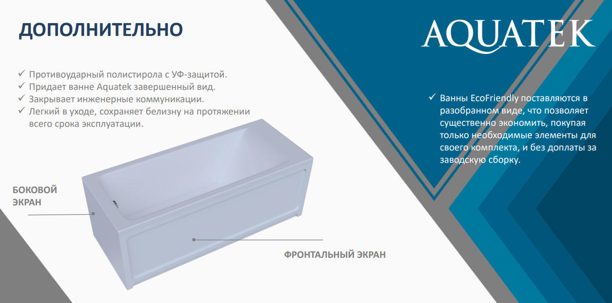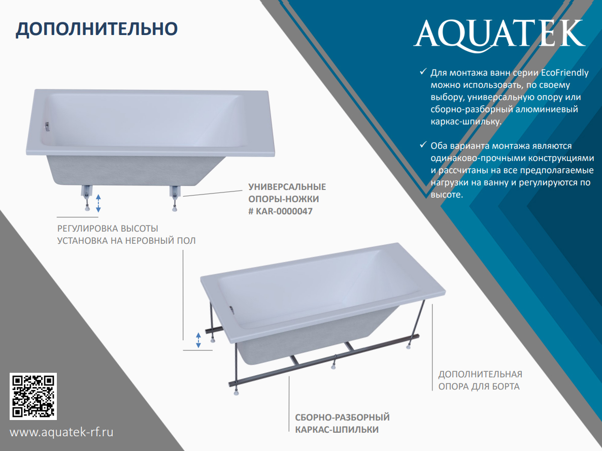 Ванны Aquatek серии EcoFriendly изготовлены из 100% акрилового листа. Дно акриловых ванн EcoFriendly дополнительно усилено толстым листом ДСП. Конструкция является надежной и долговечной. Для монтажа ванн серии EcoFriendly можно использовать, по своему выбору, универсальную опору или сборно-разборный алюминиевый каркас-шпильку. Оба варианта монтажа являются одинаково-прочными конструкциями и рассчитаны на все предполагаемые нагрузки на ванну и регулируются по высоте.