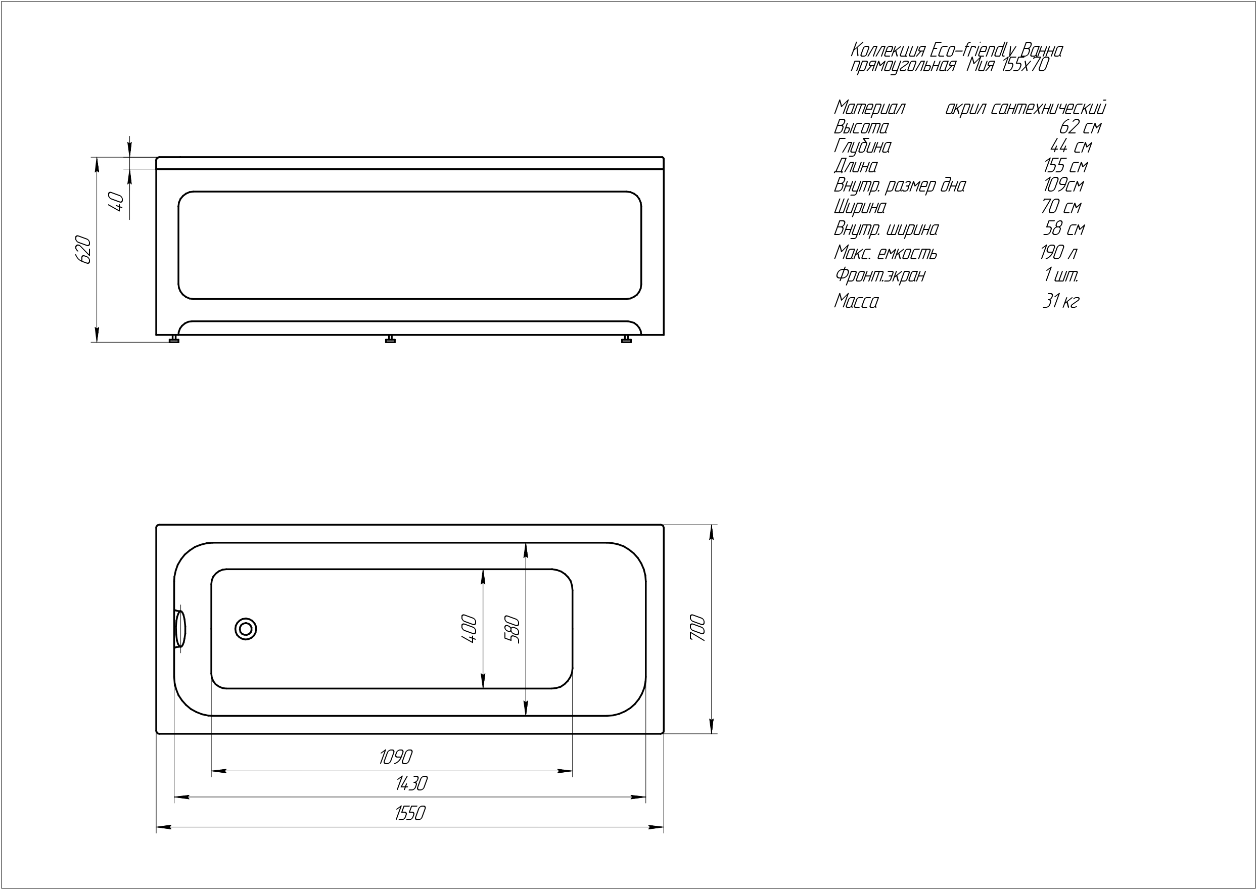 Прямоугольная акриловая ванна Акватек Eco-Friendly Мия 155x70 см MIY155-0000001