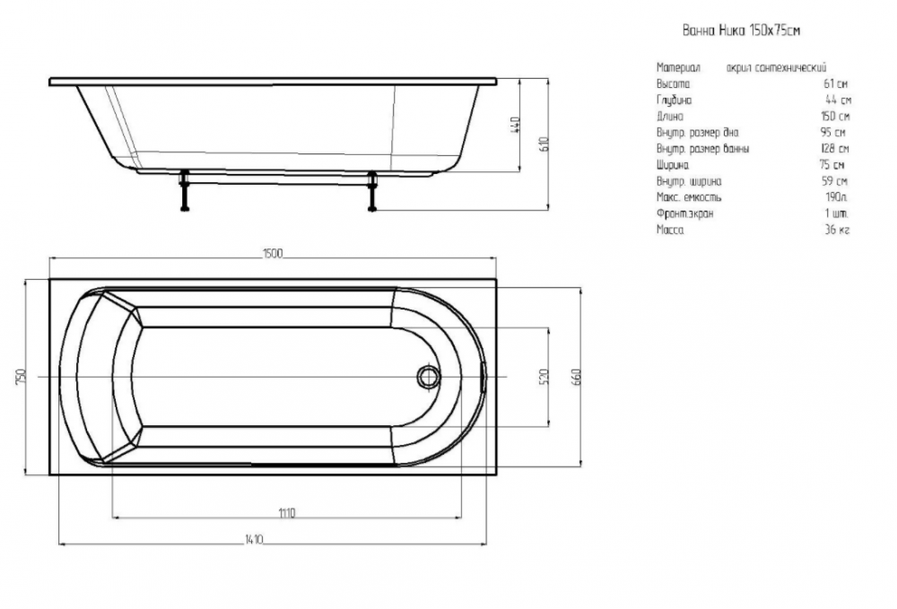 Прямоугольная акриловая ванна Акватек Eco-Friendly Ника 150х75 см NIK150-0000001
