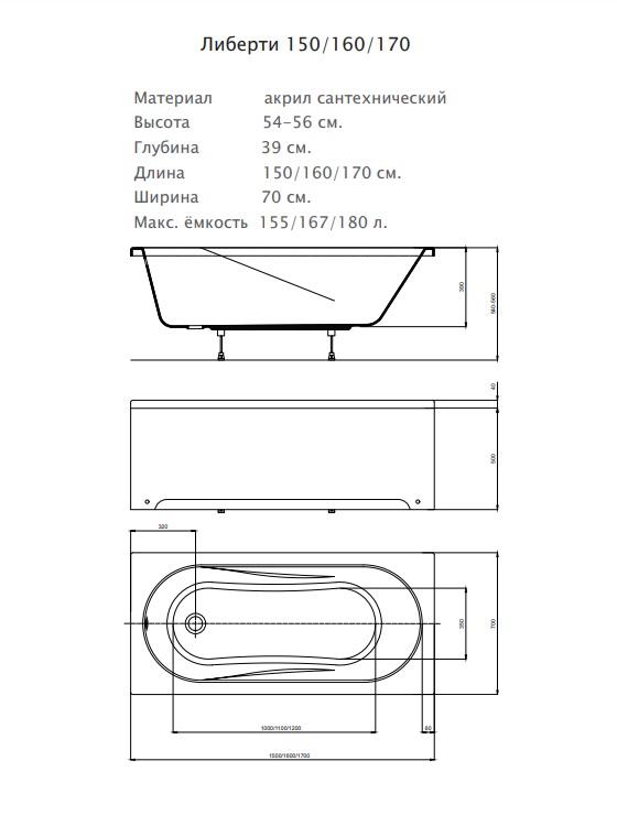 Прямоугольная акриловая ванна Акватек Lifestyle Либерти 170x70 см BER170-0000001