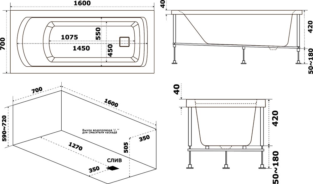 | Оснащение | Ванна+каркас/ отдельно заказываются слив-перелив, экран |