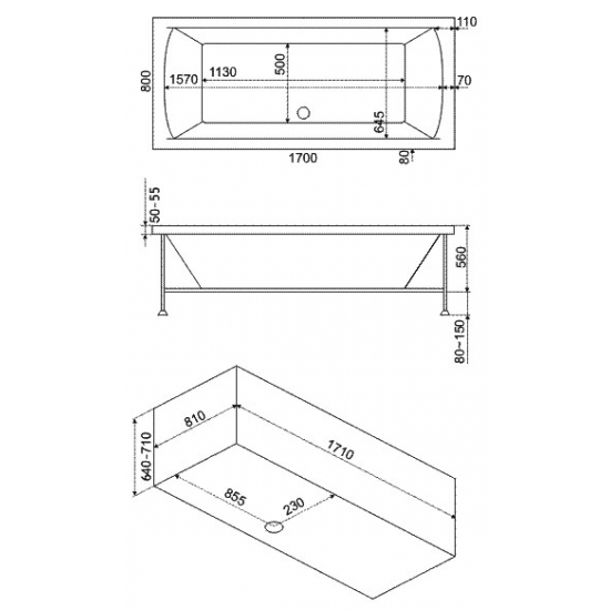 Прямоугольная акриловая ванна BAS Индика 170х80 см, с каркасом В 00013