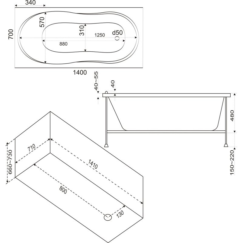 | Оснащение | Ванна в разборе/ требуется каркас, слив-перелив |