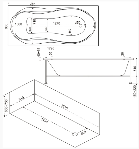 | Оснащение | Ванна+каркас/ отдельно заказываются слив-перелив, экран, г/м |