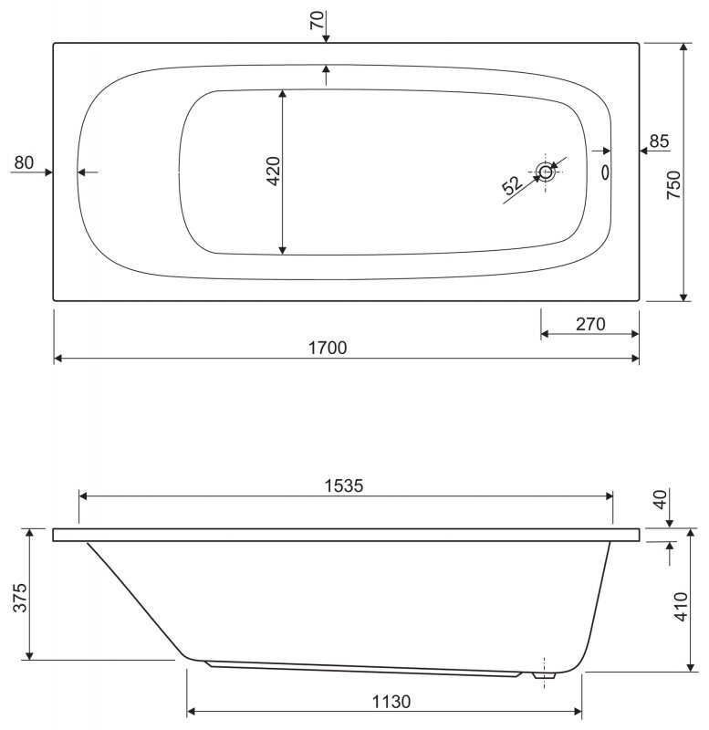 Прямоугольная акриловая ванна Cezares Eco 170х75 см ECO-170-75-41-W37