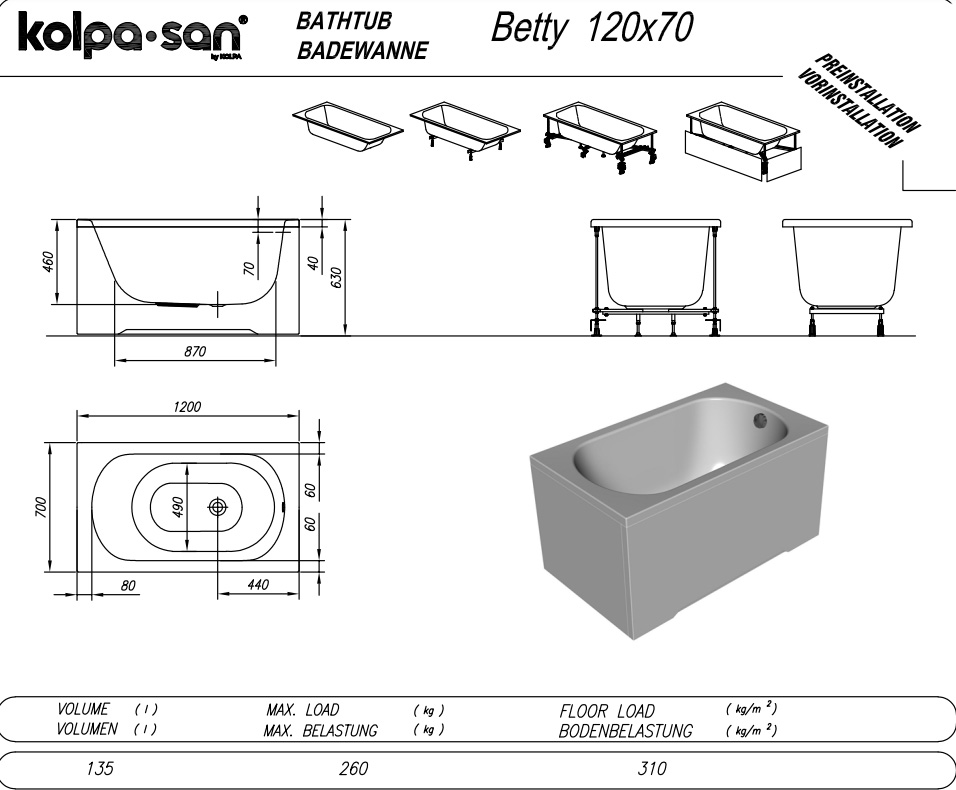 Прямоугольная акриловая ванна Kolpa-san Betty 120х70 см, с каркасом, сливом-переливом 567730