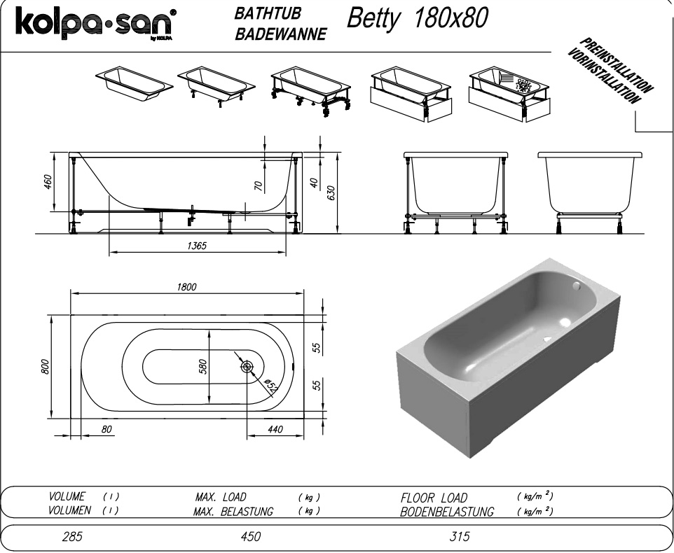 Прямоугольная акриловая ванна Kolpa-san Betty 180х80 см, с каркасом, сливом-переливом 565800
