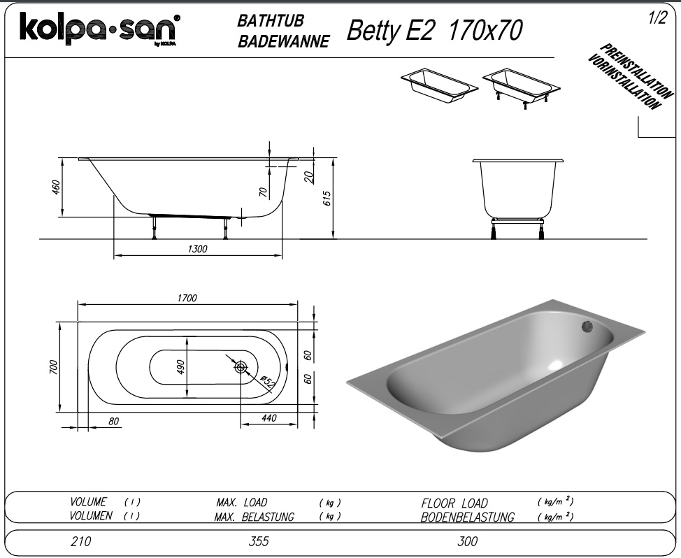 Прямоугольная акриловая ванна Kolpa-san Betty E2 170x70 см (тонкий борт) с каркасом, сливом-переливом 567780