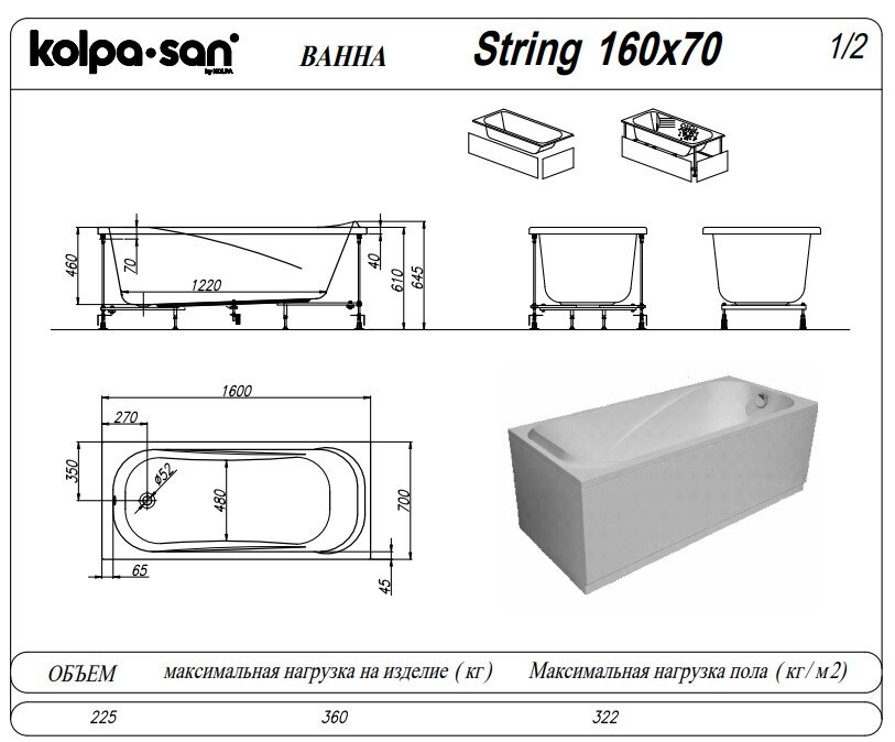 Прямоугольная акриловая ванна Kolpa-san QUAT String 160x70 см