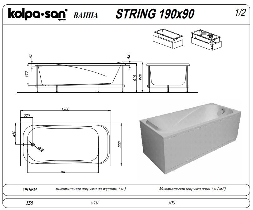Прямоугольная акриловая ванна Kolpa-san QUAT String 190x90 см