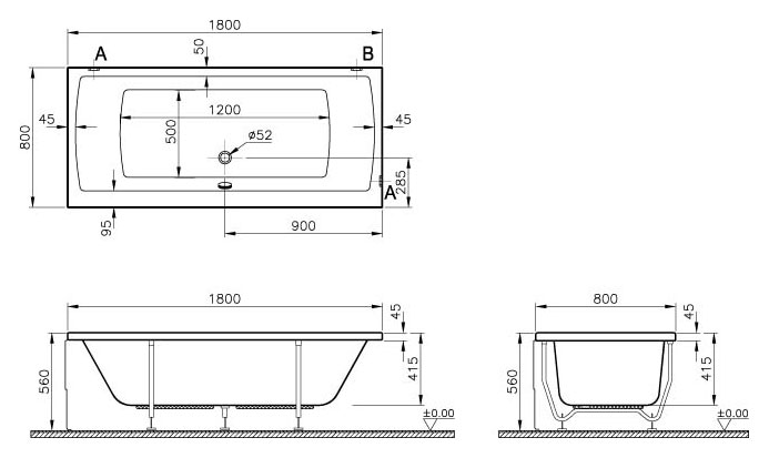 Прямоугольная акриловая ванна Vitra Neon 180х80 см слив в центре 52540001000