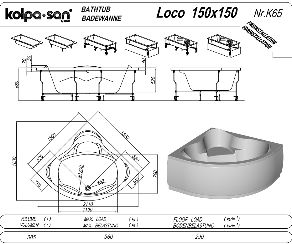 Чаша имеет комфортную глубину 52 см и представлена в едином размере 150х150. Ванна Kolpa-San LOCO - прекрасный выбор для семьи с детьми.