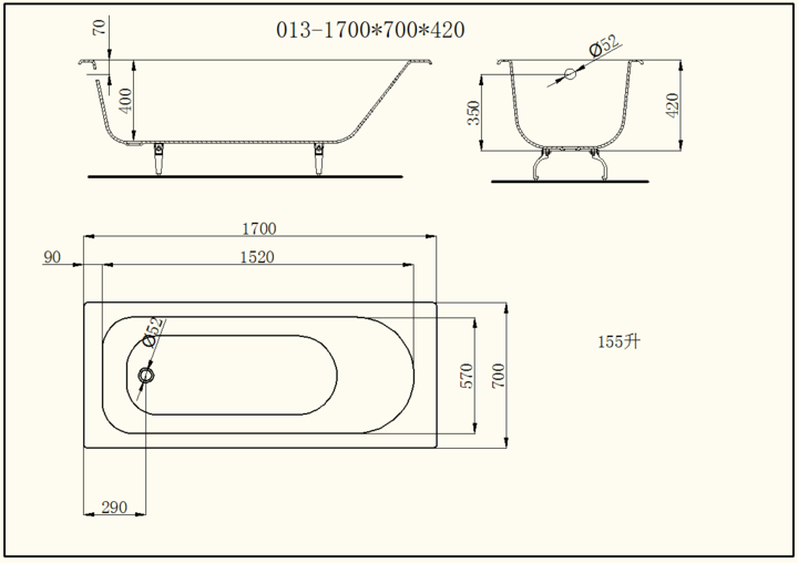 | Оснащение | Чаша ванны, 4 чугунные ножки, ручки латунь хром |