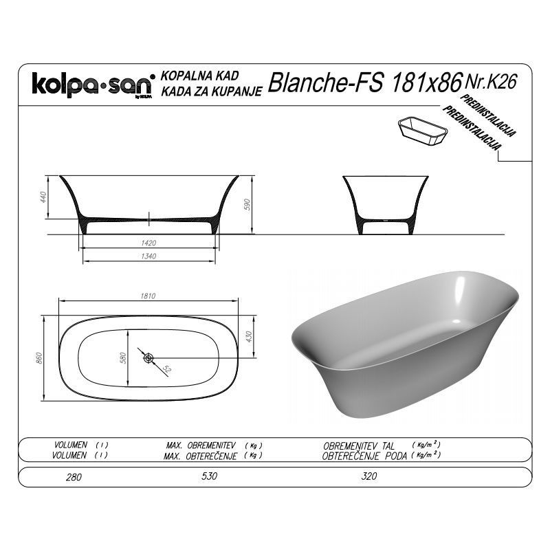 Отдельностоящая каменная ванна Kolpa-san Kerrock Blanche FS 180x85 см WHITE 561090