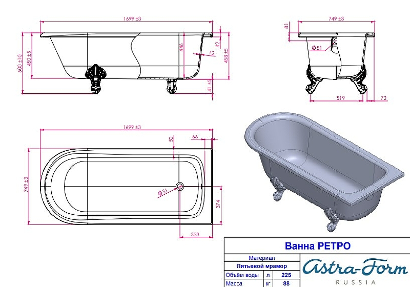 Ванна из литьевого мрамора Astra-Form Ретро 170х75 см, с ножками 01010006
