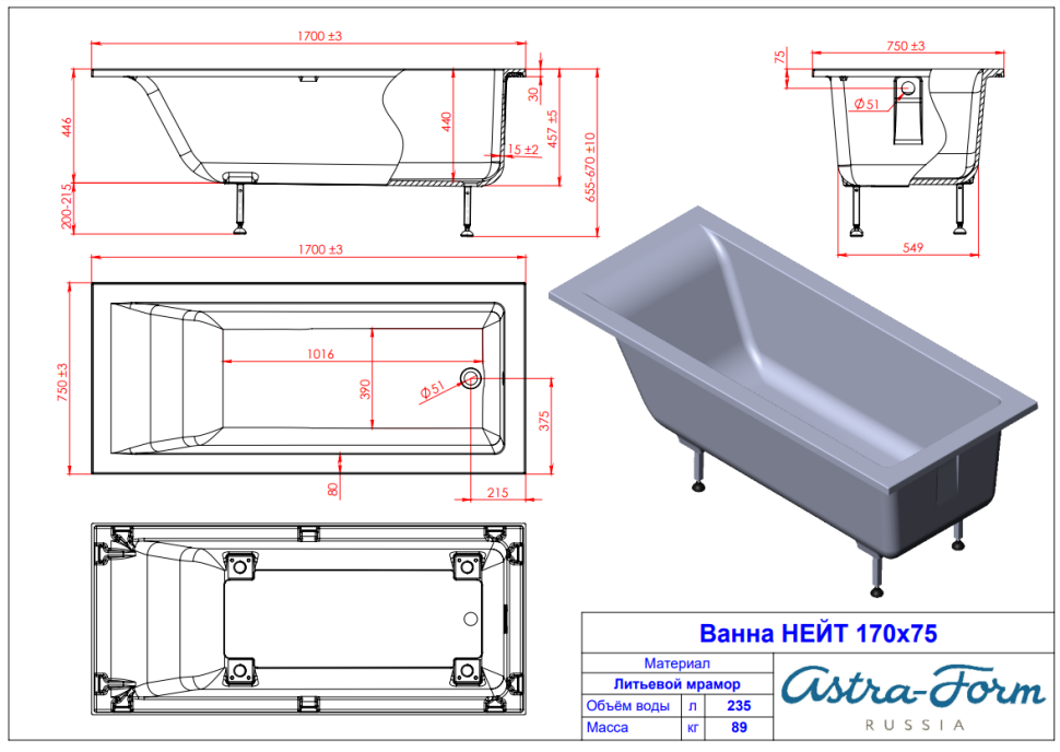 Ванна из литьевого мрамора Astra-Form Нейт 170х75 см, с ножками 01010046