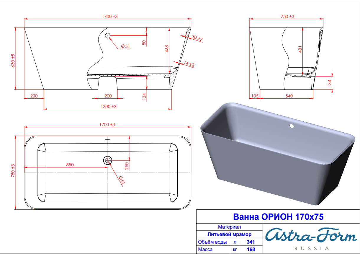 Ванна из литьевого мрамора Astra-Form Орион 170х75 см 01010021