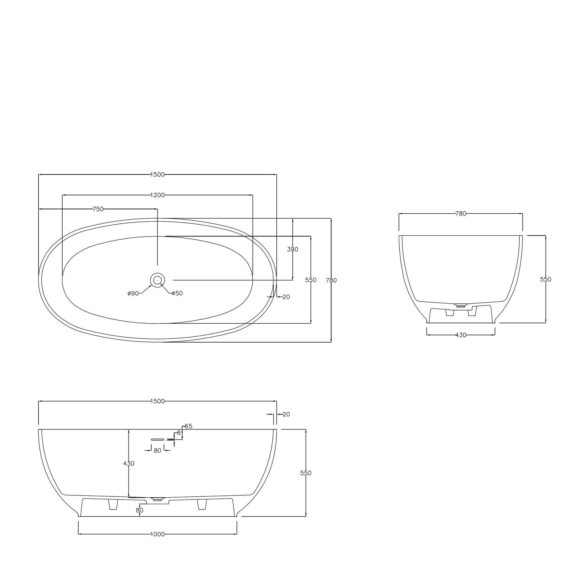 Ванна из искусственного камня ABBER Stein 150х78 см белый матовый AS9641-1.5