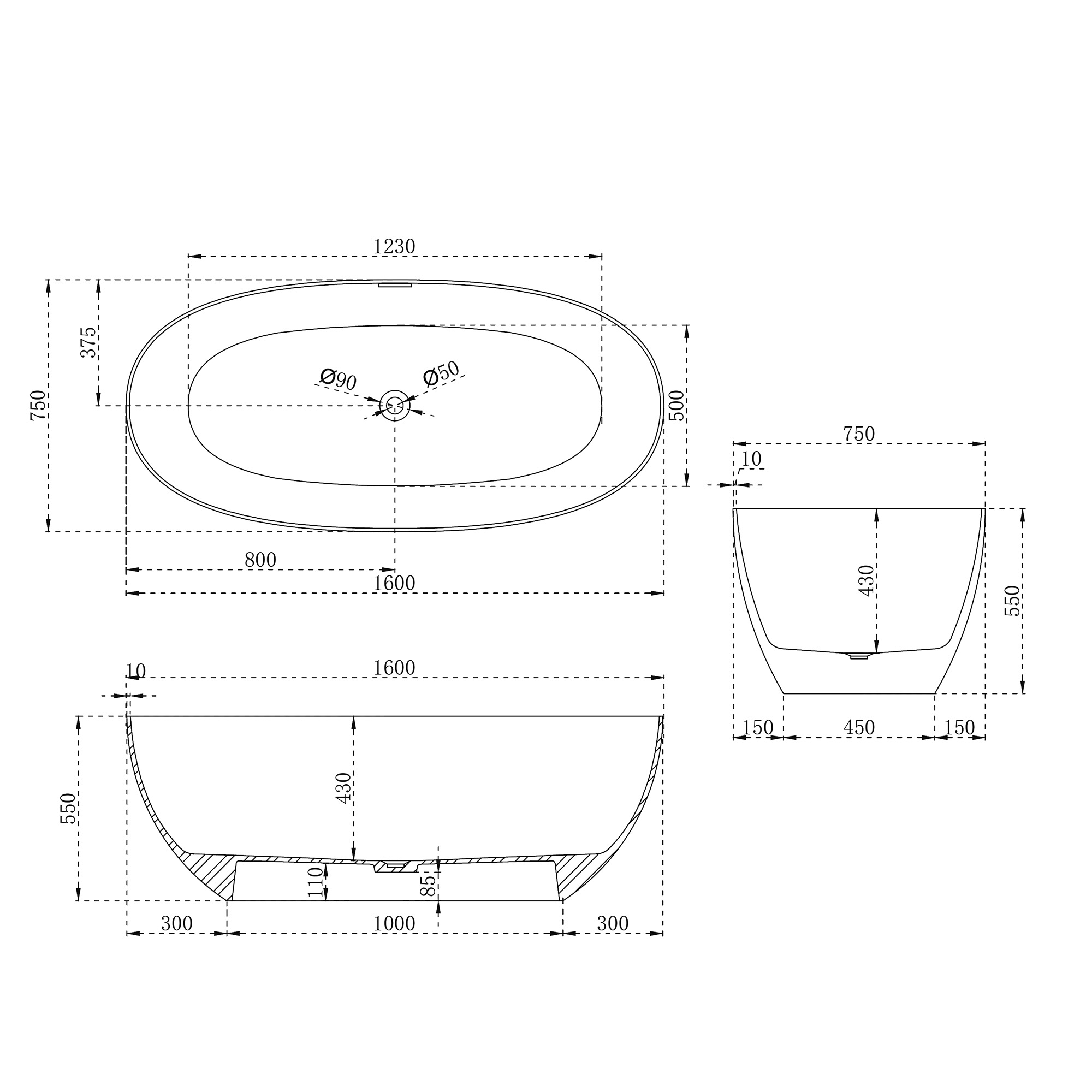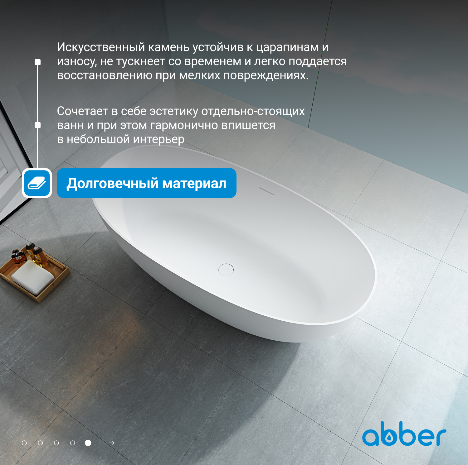 - Ванна из искусственного камня Abber Stein 160х72 см белый матовый AS9624-1.6