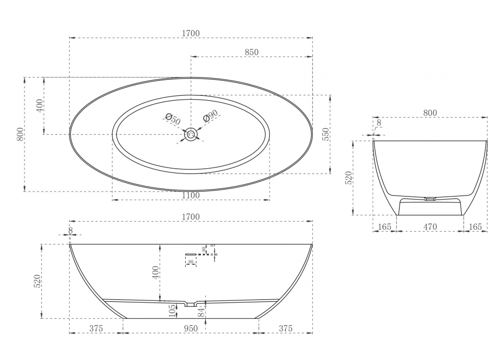 - Ванна из искусственного камня Abber Stein 170х80 см белый матовый AS9625-1.7