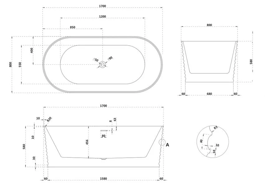 - Ванна из искусственного камня ABBER Stein 170х80 см белый матовый AS9650