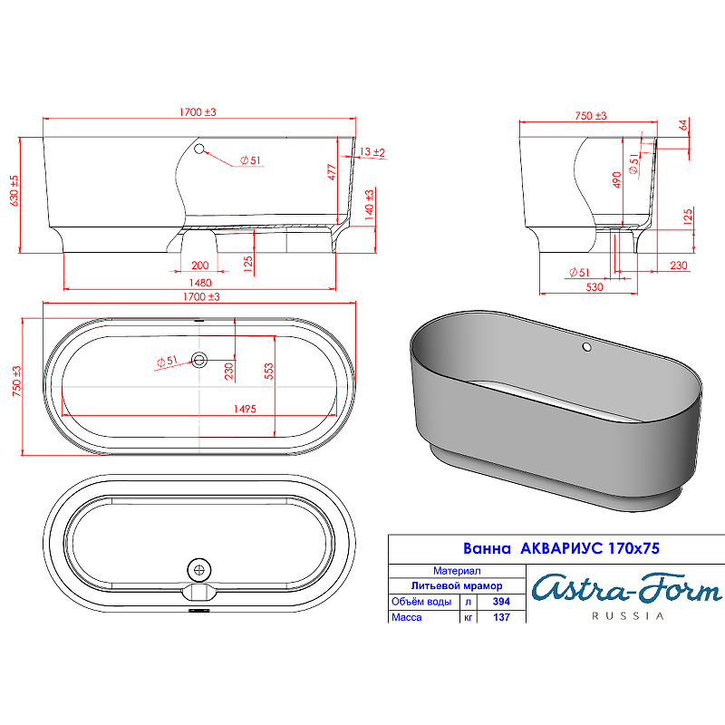 Ванна из литьевого мрамора Astra-Form Аквариус 170х75 см 01010045