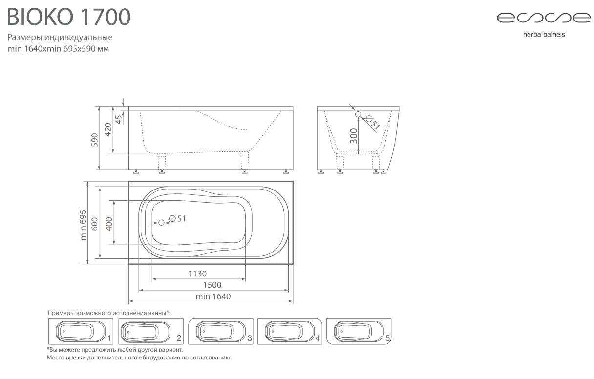 Ванна из искусственного камня ESSE Bioko 170 (от 164х69,5 см) EBIO1640