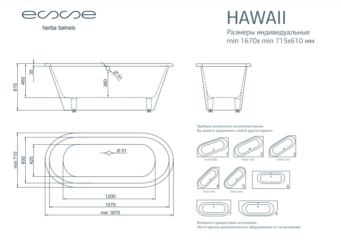 Ванна из искусственного камня ESSE Hawall от 167х71,5 см EHAW1670