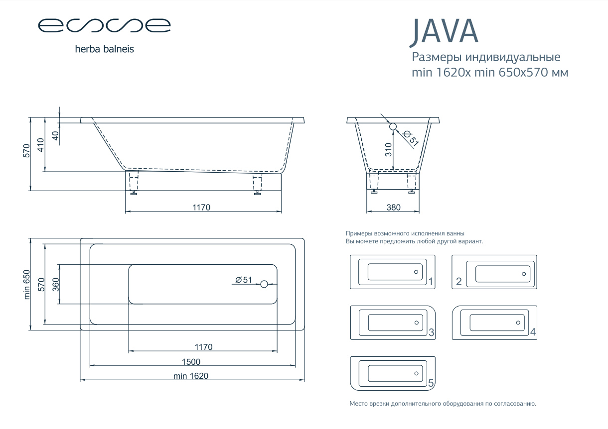 Ванна из искусственного камня ESSE Java от 162х65 см EJAV1620