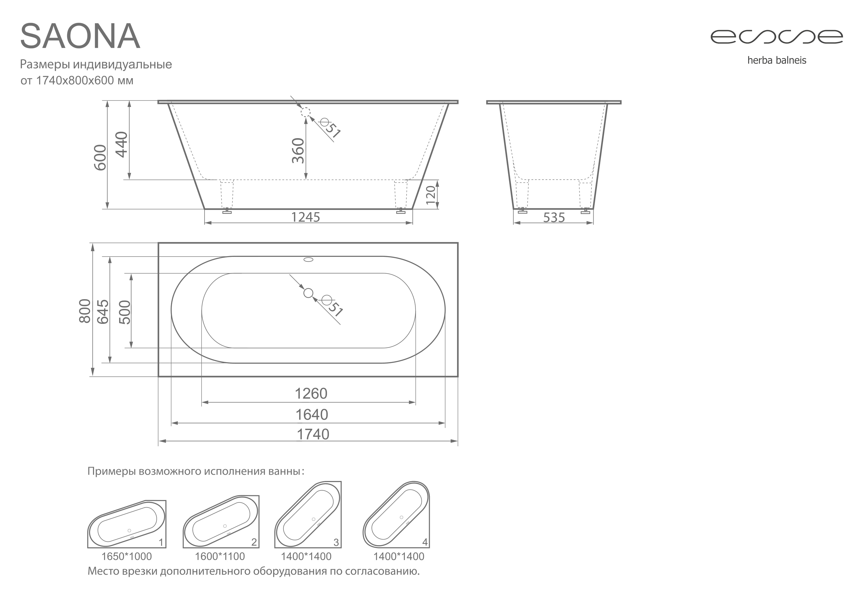 Ванна из искусственного камня ESSE Saona от 174х80 см ESAO1740