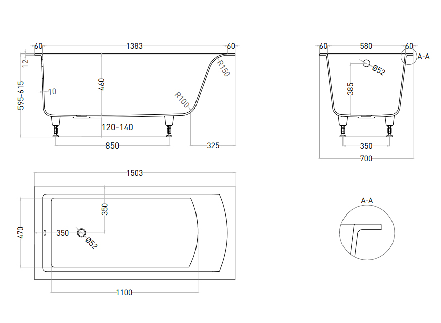 Ванна из искусственного камня Salini Cascata 150x70 (S-Sense) белый глянец 105011G
