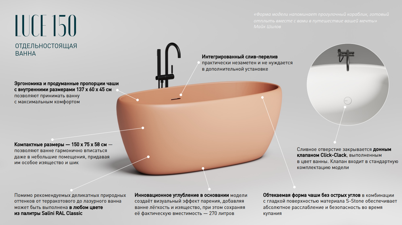Обтекаемая форма чаши с шелковистой поверхностью материала S-Stone обеспечивают максимальное расслабление и безопасность во время водных процедур. Нижняя часть контура ванны слегка приподнята над полом, создавая парящий эффект. Благодаря продуманным пропорциям и особой эргономике ванна LUCE 150 обеспечит комфортное пространство для отдыха даже для людей высокого роста. Учитывая размеры модели, она прекрасно впишется даже в небольшие интерьеры, придавая им особое изящество и шик.