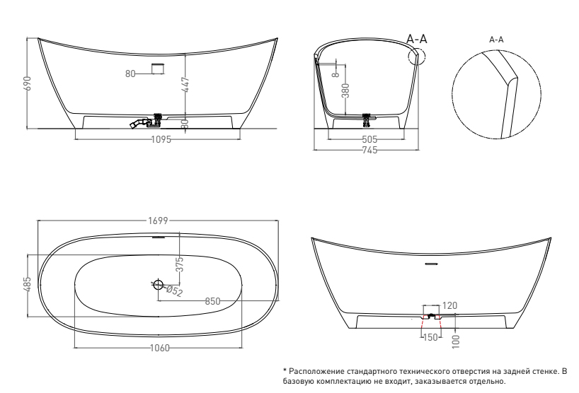 | Оснащение | Интегрированный слив-перелив, донный клапан Click-Clack в цвет ванны, сифон |