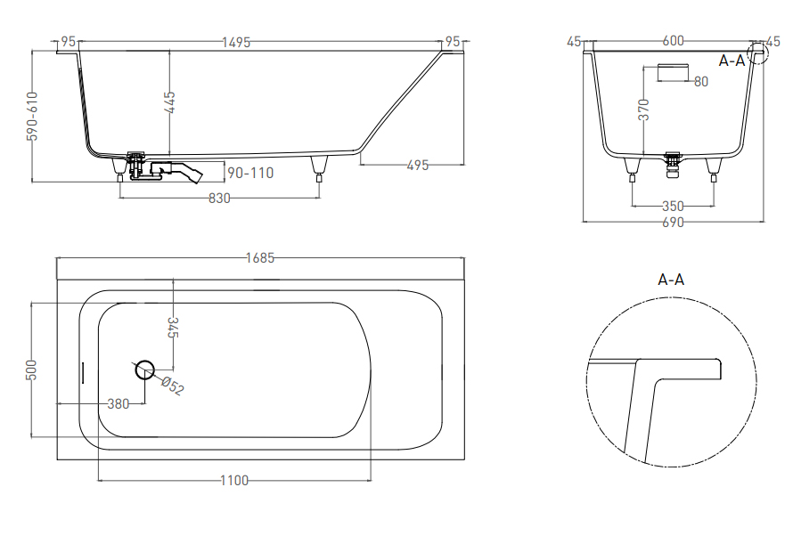 | Оснащение | Регулируемые ножки, интегрированный слив-перелив, сифон, донный клапан Click-Clack в цвет ванны |