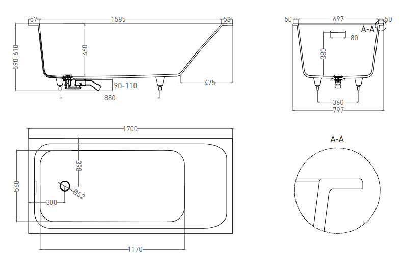 | Оснащение | Регулируемые ножки, интегрированный слив-перелив, сифон, донный клапан Click-Clack в цвет ванны |