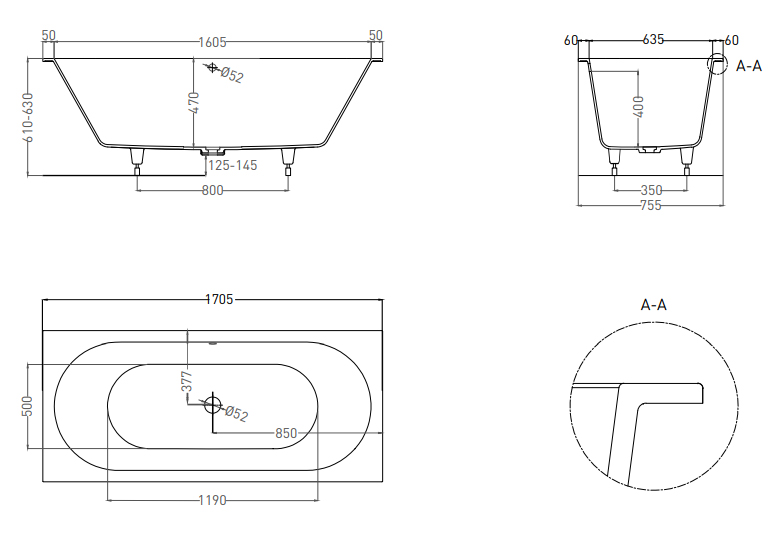 Модель подходит как для полного или частичного встраивания. Ванна отличается симметричностью за счёт центрального расположения классических круглых отверстий для слива-перелива и донного клапана, а также равномерного уклона боковых сторон изделия. Название модели Axis («Ось») подчёркивает её симметричный дизайн во фронтальной проекции. Модель не комплектуется сифоном и донным клапаном.
