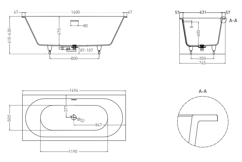 | Оснащение | Регулируемые ножки, интегрированный слив-перелив, сифон, донный клапан Click-Clack в цвет ванны |