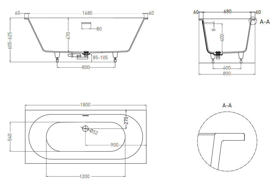 | Оснащение | Регулируемые ножки, интегрированный слив-перелив, сифон, донный клапан Click-Clack в цвет ванны |