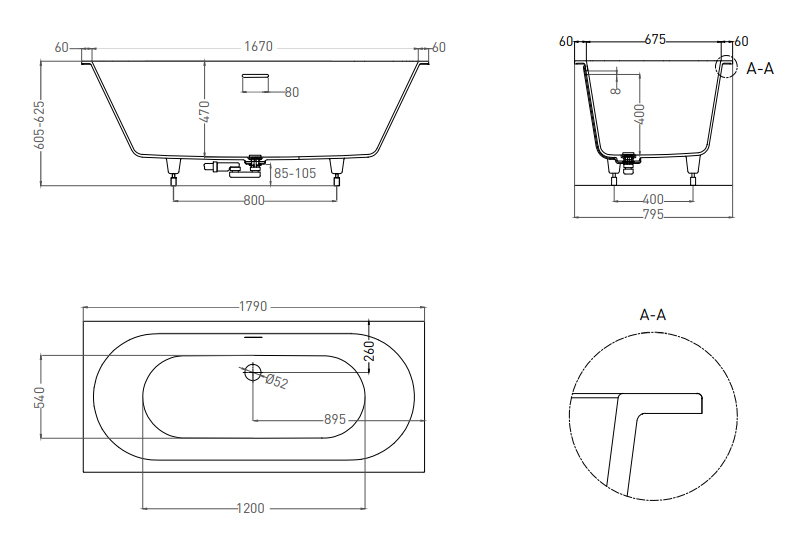 | Оснащение | Регулируемые ножки, интегрированный слив-перелив, сифон, донный клапан Click-Clack в цвет ванны |