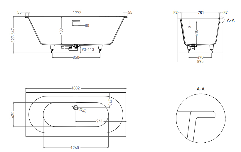 | Оснащение | Регулируемые ножки, интегрированный слив-перелив, сифон, донный клапан Click-Clack в цвет ванны |