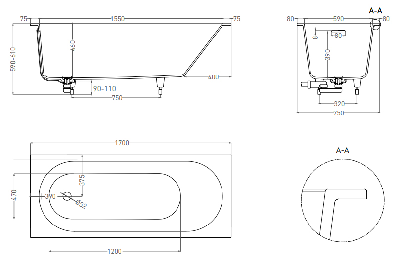 | Оснащение | Регулируемые ножки, интегрированный слив-перелив, сифон, донный клапан Click-Clack в цвет ванны |